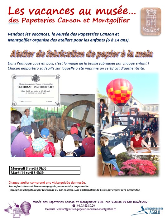 Pendant les vacances, le Musée des Papeteries Canson et Montgolfier organise des ateliers de fabrication de papier à la main pour les enfants. Les prochains auront lieu les mercredi 8 avril et mardi 14avril 2026 à 9h30.
